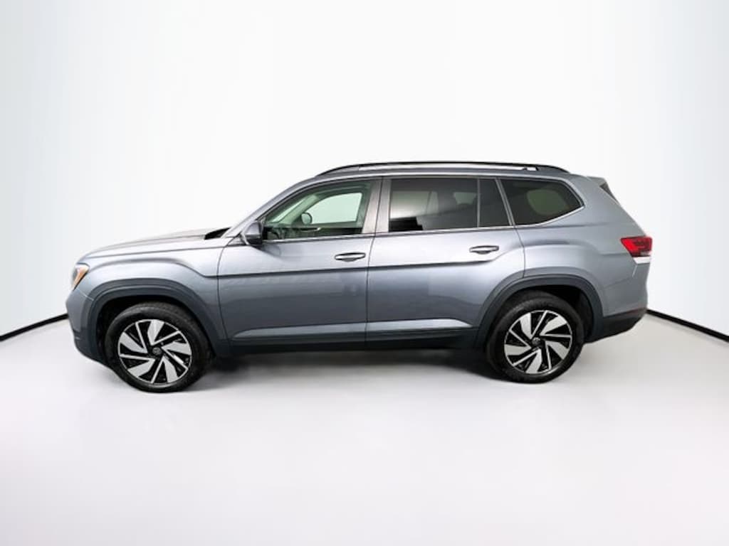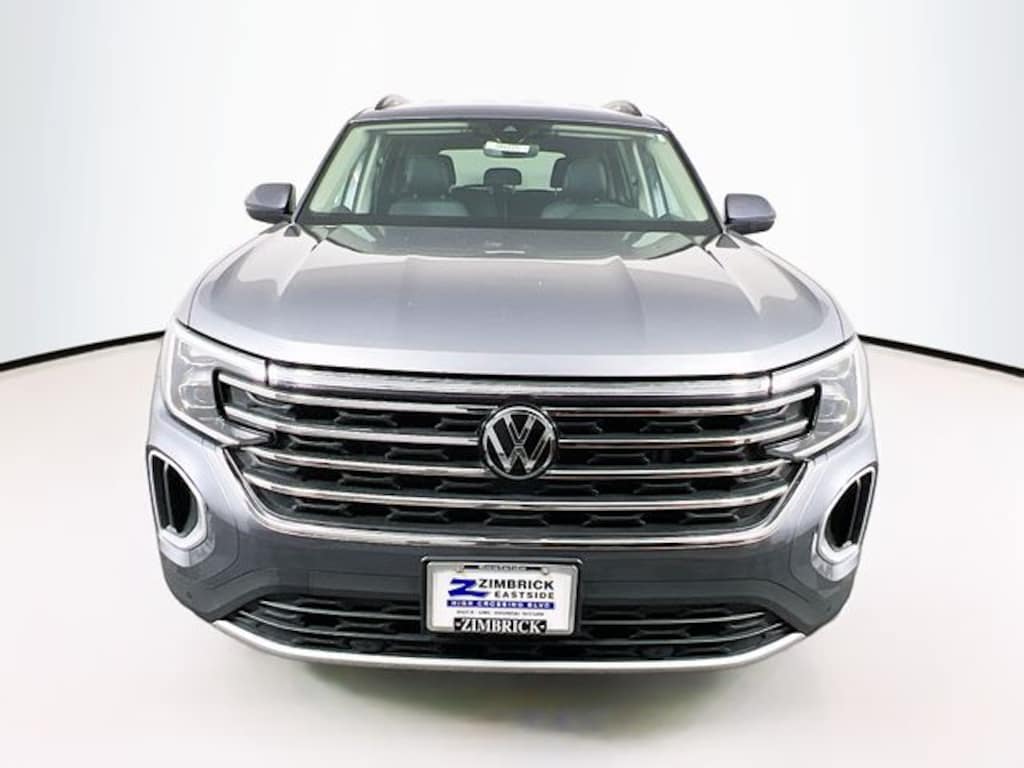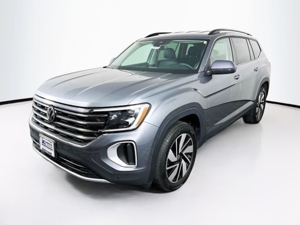 Silver 2025 Volkswagen Atlas 2.0T SE w/Technology AWD 8-Speed Automatic with Tiptronic 2.0L TSI 3rd row seats: split-bench, 4-Wheel Disc Brakes, 6 Speakers, ABS brakes, Air Conditioning, Alloy wheels, AM/FM radio: SiriusXM with 360L, Auto High-beam Headlights, Auto-dimming Rear-View mirror, Automatic temperature control, Brake assist, Bumpers: body-color, Compass, Delay-off headlights, Driver door bin, Driver vanity mirror, Dual front impact airbags, Dual front side impact airbags, Electronic Stability Control, Emergency communication system: VW Car-Net Safe & Secure 5-year, Exterior Parking Camera Rear, Four wheel independent suspension, Four-wheel Independent Suspension, Front anti-roll bar, Front Bucket Seats, Front Center Armrest, Front dual zone A/C, Front fog lights, Front reading lights, Fully automatic headlights, Heated & Actively Ventilated Front Bucket Seats, Heated door mirrors, Heated front seats, Heated steering wheel, Illuminated entry, Low tire pressure warning, Occupant sensing airbag, Outside temperature display, Overhead airbag, Overhead console, Panic alarm, Passenger door bin, Passenger vanity mirror, Perforated V-Tex Leatherette Seating Surfaces, Power door mirrors, Power driver seat, Power Liftgate, Power steering, Power windows, Radio data system, Radio: MIB3 Composition Media, Rain sensing wipers, Rear air conditioning, Rear anti-roll bar, Rear reading lights, Rear seat center armrest, Rear window defroster, Rear window wiper, Remote keyless entry, Security system, Speed control, Speed-sensing steering, Split folding rear seat, Spoiler, Steering wheel mounted audio controls, Tachometer, Telescoping steering wheel, Tilt steering wheel, Traction control, Trip computer, Turn signal indicator mirrors, Variably intermittent wipers, Ventilated front seats, Wheels: 20" 2-Tone Machined Alloy.